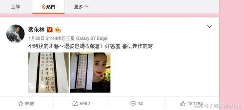 蔡依林:“小時候的才藝~還被爸媽收藏著!好害羞 書法佳作的窩”