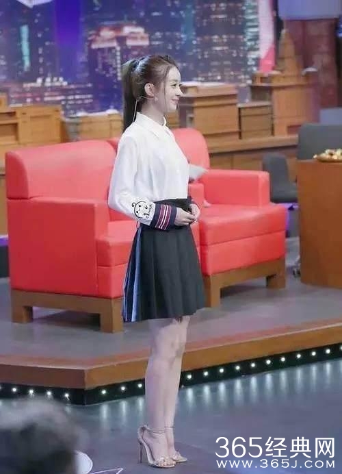 在金星秀节目现场,赵丽颖身穿Ports Pure的白色衬衫搭配Diesel Black Gold的黑色半裙,一副清纯可爱模样,笑起来十分甜美 。