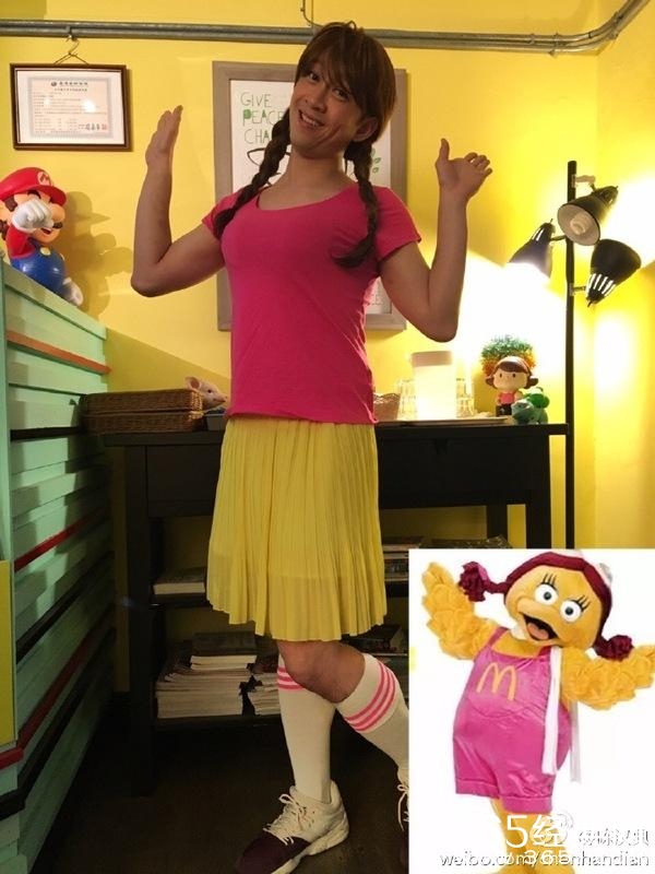 最近陈汉典微博上晒出一张模仿麦当劳公仔的照片,照片中陈汉典身穿粉色女士T恤,黄色短裙,白色女士长袜和运动鞋,不仅扎了两个辫子还垫了胸部,动作模仿麦当劳公仔,十分逗趣,引得网友纷纷点赞,有网友评论道:“简直神还原”“我可能是看到了假陈汉典”。