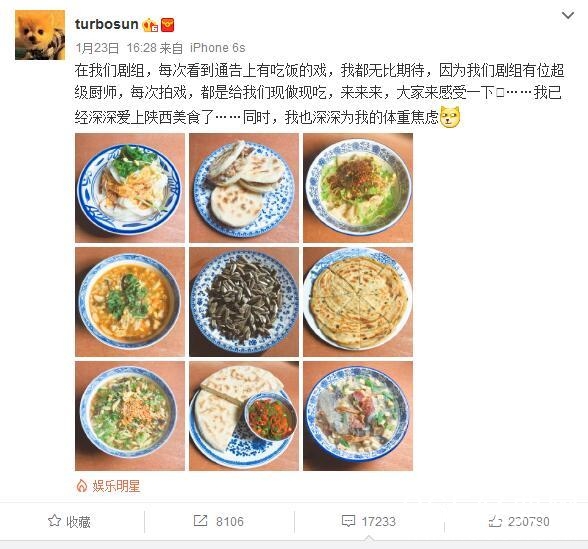 1月23日16:28 ,孙俪微博上写到:“在我们剧组,每次看到通告上有吃饭的戏,我都无比期待,因为我们剧组有位超级厨师,每次拍戏,都是给我们现做现吃,来来来,大家来感受一下……我已经深深爱上陕西美食了……同时,我也深深为我的体重焦虑”