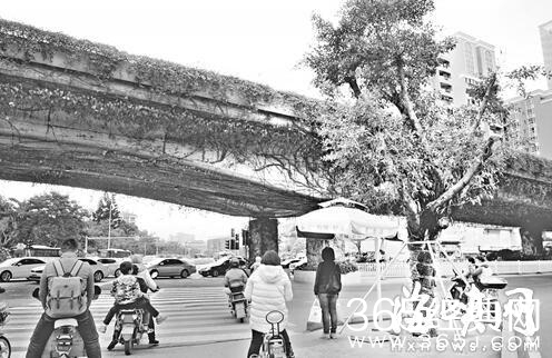 福州市区已有十九个路口的六十个安全岛种上大树(摄于龙腰高架桥下渠化岛)