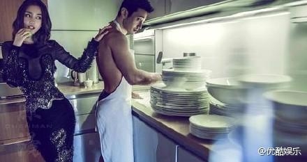 另一张在厨房的照片,也是相当养眼,黄晓明穿着「裸体围裙」在流理台洗碗,而 baby 则是一身紧身服装,身材曲线崭露无遗!