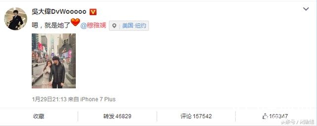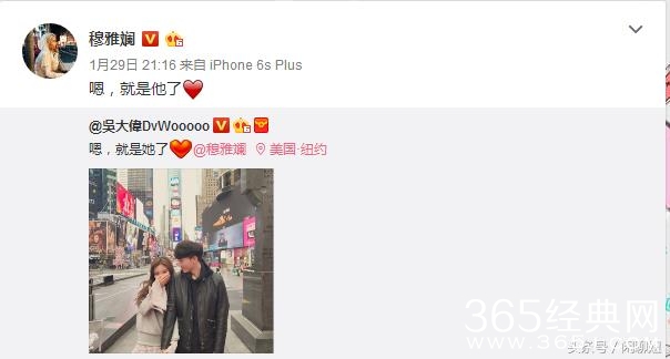 1月29日晚上,吴大伟在微博公开公布恋情,写道:嗯,就是她了。并且@了穆雅斓。还晒出了两个人手牵手漫步纽约的合影照。