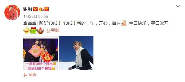 看看,我一打开手机就看到了,今天是快乐家族成员,吴析的生日。首先祝吴析同学生日快乐,新年快乐。我对吴析吧没什么好感,也没什么不好的感觉,觉得她是个很努力的人。在自身条件没那么优越的情况下,一直很努力。其实这样就挺好的,也值得我学习。看谢娜发的博文,1月29日00::55发的信息。说明个问题,这么晚了,好多人都起来上夜尿了。。谢娜还能转发吴析生日微博,表示庆祝。我觉得他们应该是在一起过生日,庆祝吴析生日快乐。我也是猜测,无论是不是,光从这一点就看出来。不管他们关系是不是特别好? 总之关系不差就对了。。。