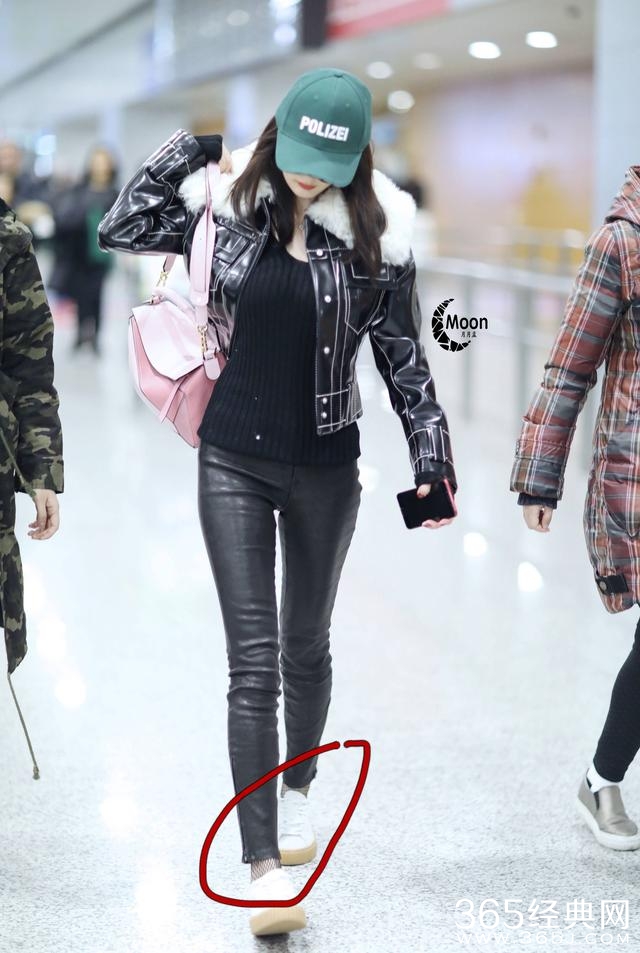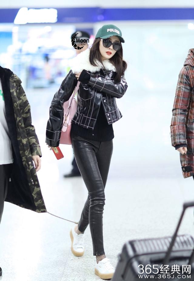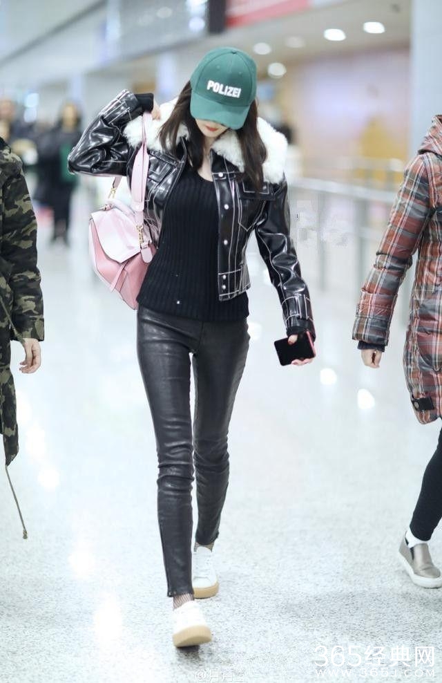 这一次,杨幂是走比较炫酷的style,上身皮衣下身皮裤,脚下踩着小白鞋。