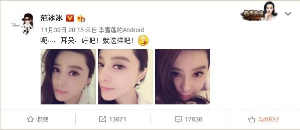 范冰冰还特意晒微博,反正人家脸长得美,耳朵的缺陷也就算了!
