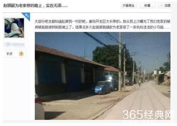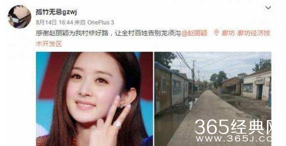 2016年8月,来自大长亭村的网友发微博称,称赵丽颖都大红大紫,那么有钱了,确实为老家捐钱修了路,并感谢她为村子里做的贡献。从新路照片来看,修过之后确实相比以前好很多。不过,这条微博很快就被删除了!