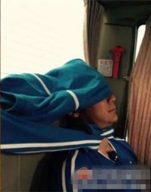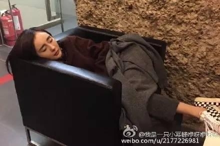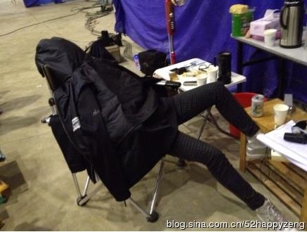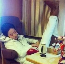 赵薇坐在折叠椅上,一只腿翘在矮桌上,蒙着羽绒服呼呼大睡,真是女汉子十足~