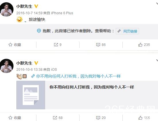 然而,当时秀恩爱的微博已经消失,叶璇删除了所有有关和男友小默先生秀恩爱互动的微博 ,小默先生的微博删的只剩下58条了 。