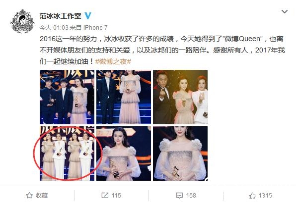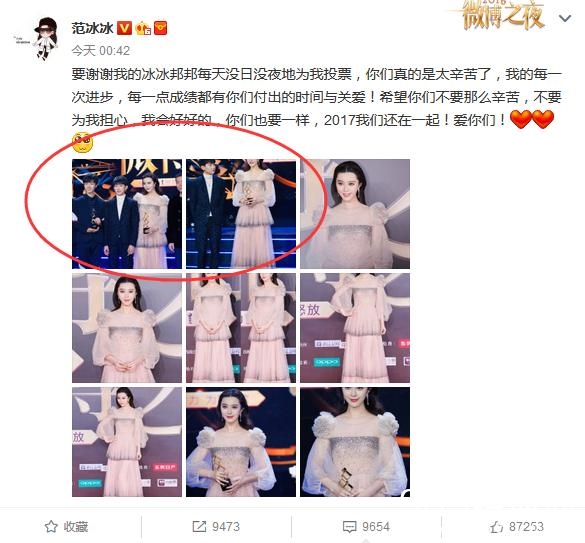 大家可以看到,这张是范冰冰工作室在冰冰获奖后发布的一组图片,其中有TFBOYS和范冰冰的合影,以及赵薇和范冰冰的合影。