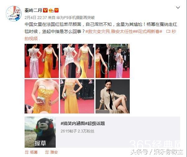 近日有营销号又开始黑杨幂了,博主@秦岭二月 发微博表示杨幂戛纳红毯竖中指!