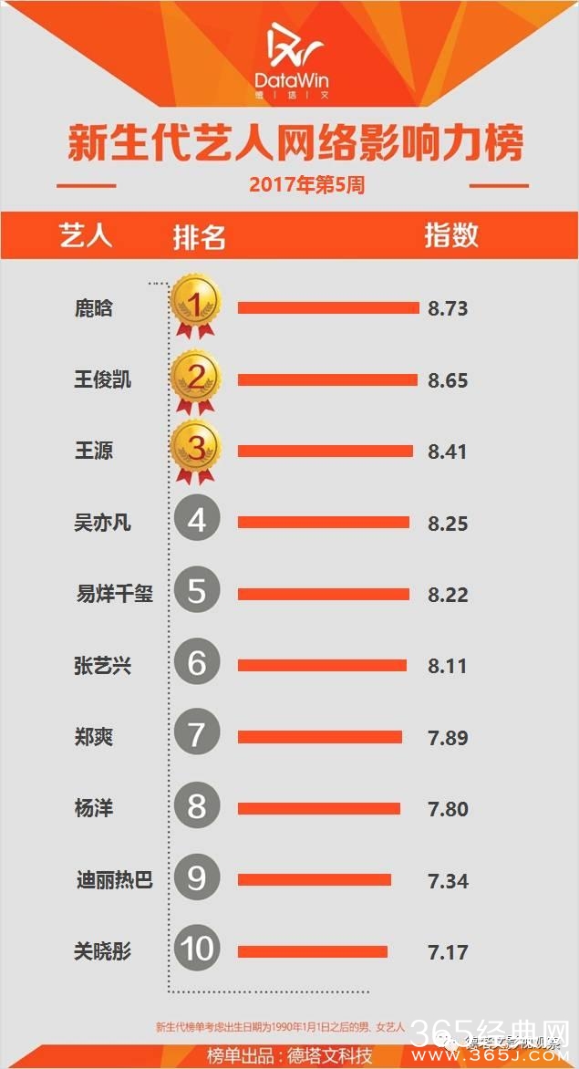 90后新生代艺人网络影响力TOP20: