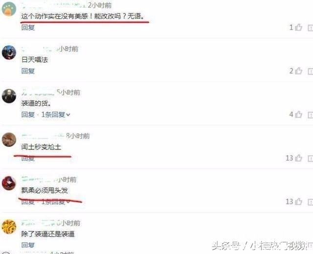 网友对张杰这一动作的评论截图,有网友说“这动作实在没有美感,能改改吗?无语”,还有网友把这一动作与张杰与谢娜结婚几年没有孩子扯上关系,不知道谢娜看了作何感想?