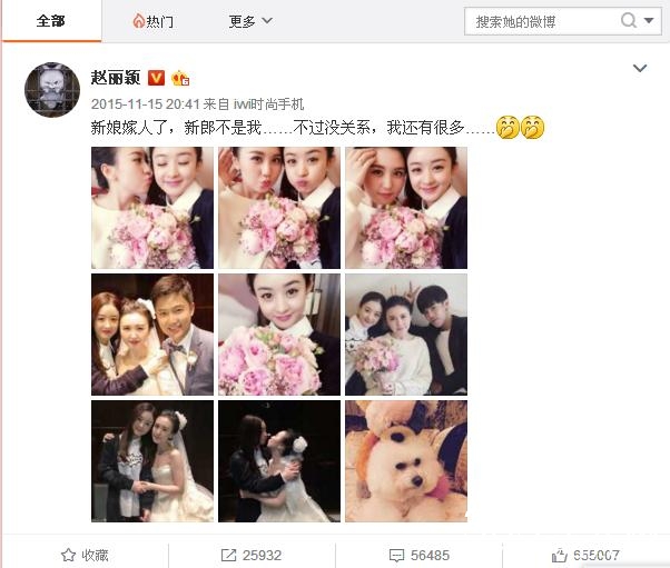 原本以为从不参加明星婚礼的赵丽颖,是不会参加李盼的婚礼的。但赵丽颖不但出现在李盼的婚礼现场,还接到了捧花。当天晚上,兴奋的赵丽颖还在微博上晒出了自己和新郎新娘的合照以及和好闺蜜的单独合照。只是颖宝你也要快点找到幸福才好呀……