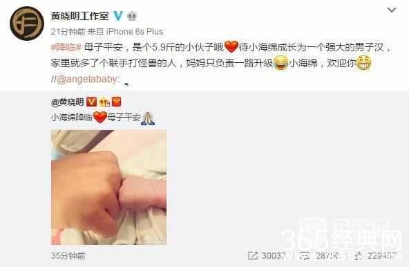 黄晓明之妻Angelababy在香港顺利生子,当晚Angelababy生子黄晓明当爹之事立即登上各大娱乐版面头条。随后黄晓明在微博中晒出与儿子拳对拳的照片,附文称“小海绵降临,母子平安”。Baby也转发黄晓明的微博,并附上一朵玫瑰。