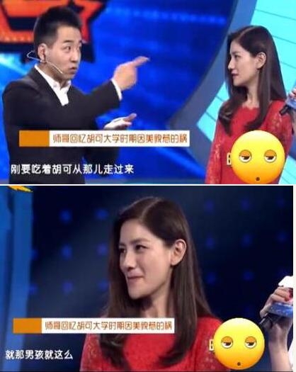 妹妹今天看了一个节目,发现胡可她在参加。节目中胡可她的师哥说到胡可她年轻时候可是很漂亮的。因为她漂亮还惹出了不少的事儿。比如这件,因为胡可她在食堂打饭,一男生看到胡可眼睛都离不开了,结果后来被班上的男生伸脚绊了一下,摔了个狗吃屎。吓得胡可赶紧跑掉。