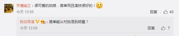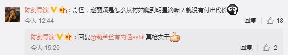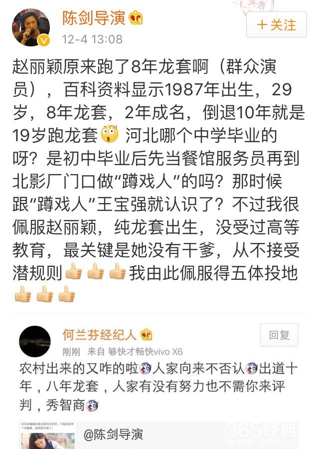 以上她的经纪人说的话很有道理,赵丽颖她确实是跑了八年的龙套才成为女主,她出身并不能成为评判一个人的标准,陈剑导演他随后表示佩服赵丽颖但在微博中与网友的对话却又是处处针对赵丽颖“简单能从村姑混到明星?”“奇怪,赵丽颖她是怎么从村姑爬到明星滴呢?就没有付出代价