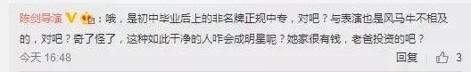 近日有号称“张艺谋大舅子”的导演陈剑在大骂王宝强、力挺马蓉之后又作妖了,这次她羞辱的是演员赵丽颖。12月4日,陈剑连发数条微博暗讽赵丽颖“农村出身,没文化、跑龙套”,不过是村姑变凤凰。