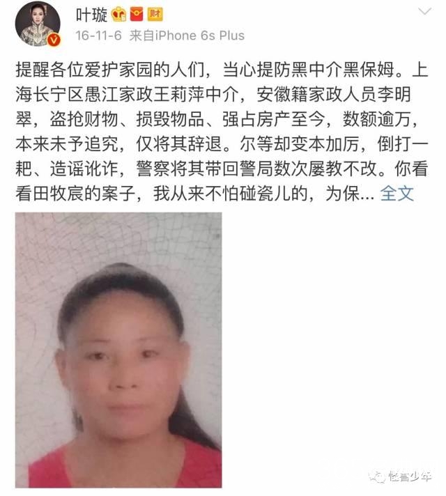 去年11月,叶璇的保姆曝光叶璇拖欠工资。