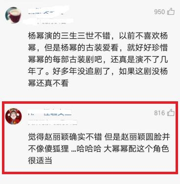 针对两家粉丝的大战,有些网友的回复就要机智多了,既可以轻松终止杨幂、赵丽颖两家粉丝关于角色的争斗,而且也不会得罪任何一方。该网友表示“赵丽颖的娃娃脸衬托不出九尾狐的妖媚”。不知网友对于赵丽颖不适合演白浅这一角色的解释有没有让粉丝们满意?