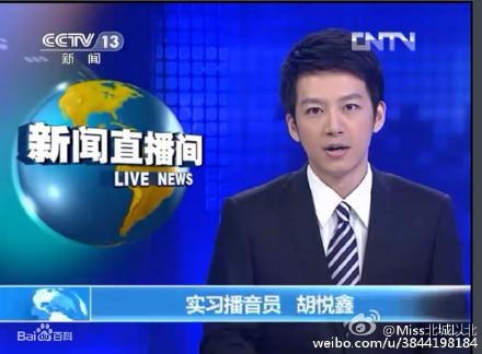胡悦鑫,2012年4月23日晚第一次出镜以实习主播身份在央视13套新闻直播间正式亮相,播出"关注法国总统选举"新闻,也因帅气的外表受到众多网友追捧,迅速走红网络。