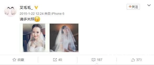 2015年1月,艾楚怡在微博上发了两张身穿婚纱的照片,并留言说:“请多多关照”。网友纷纷祝福她新婚愉快,猜测新郎就是胡悦鑫。真好,终成眷属呢~