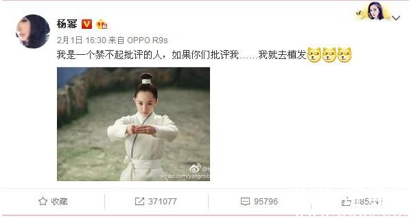 面对网友们的调侃,杨幂在自己也在微博里回应说:“自己经不起批评,大家在批评的话,自己就要去植发了,”此话一出,顿时萌翻了众人,这个可能性也不是没有的哦!不过也有网友支持:“这个世上只有一个杨幂,她是独一无二的。”