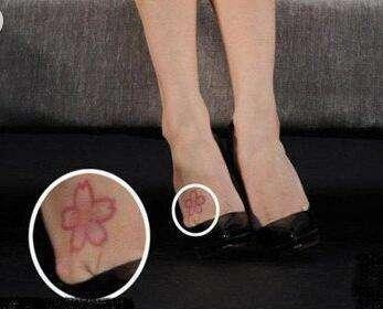 Angelababy的纹身有三处,第一处在脚背上,梅花形的纹身是不是很美?