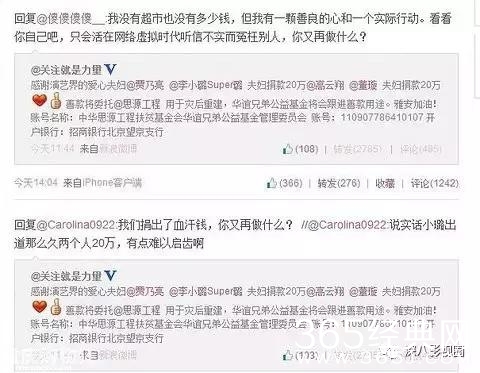 另一回,李小璐夫妇为灾区捐款20万,却被网友酸说这个数目“难以启齿”。李小璐挂出对方评论并怒怼:我们捐出了血汗钱,你在做什么?