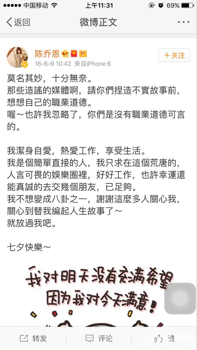 陈乔恩事后又出来回应过这件事情,相信无论是关于37还在演脑残戏,还是关于怼了自己的真爱粉,她都觉得心里不是很好受。