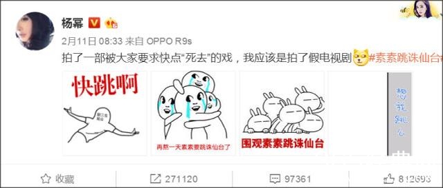 杨幂也还曾因为这个发微博自嘲拍了这么多的戏,第一次被逼着快点去死的···甚至怀疑自己拍了家电视剧,真是搞笑了我的幂幂。