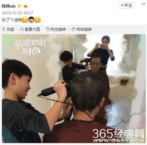 儿子给张艺谋剃头发,妈妈就在一旁拍照。