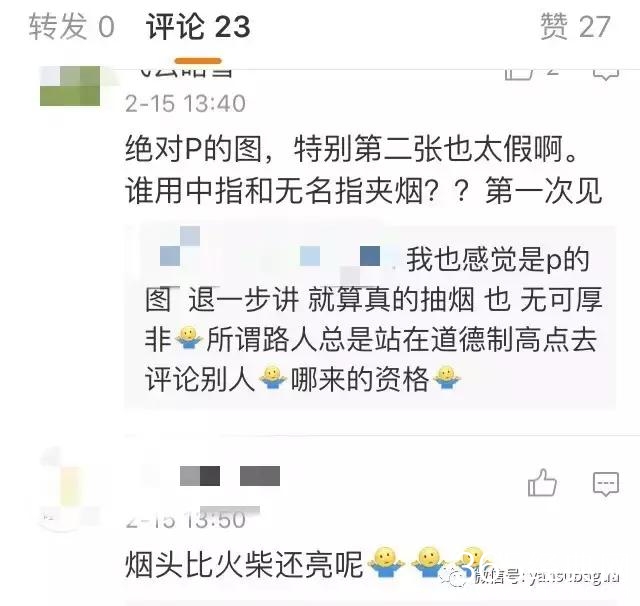 继而列举“抽烟图是PS”的证据:烟头太亮像P的,还有什么夹烟姿势