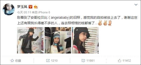 这条微博配文说:“刚看到了安哥拉贝比(angelababy)的旧照,感觉我的自拍被放上去了,谢谢这世上还有跟我长得差不多的人,连去照相馆的钱都省了…”。