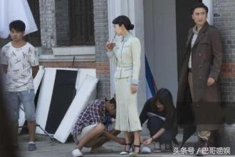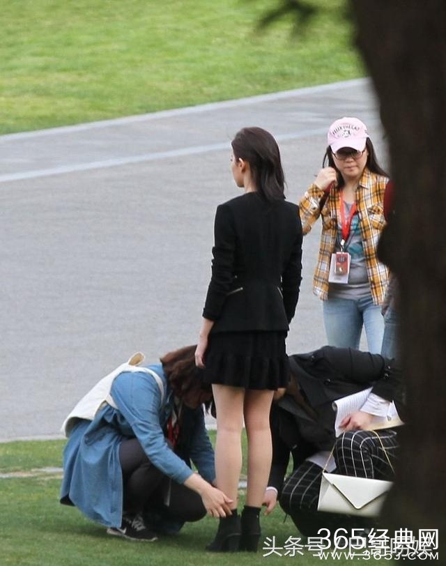 短裙现身片场,还让助理给她系鞋带。