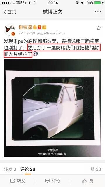 最近和唐嫣合作的摄影师柳宗源发博称,帮唐嫣拍的大片里,唐嫣未PS的图都那么美,所以“涂了一层防晒就把糖的封面大片给拍了”
