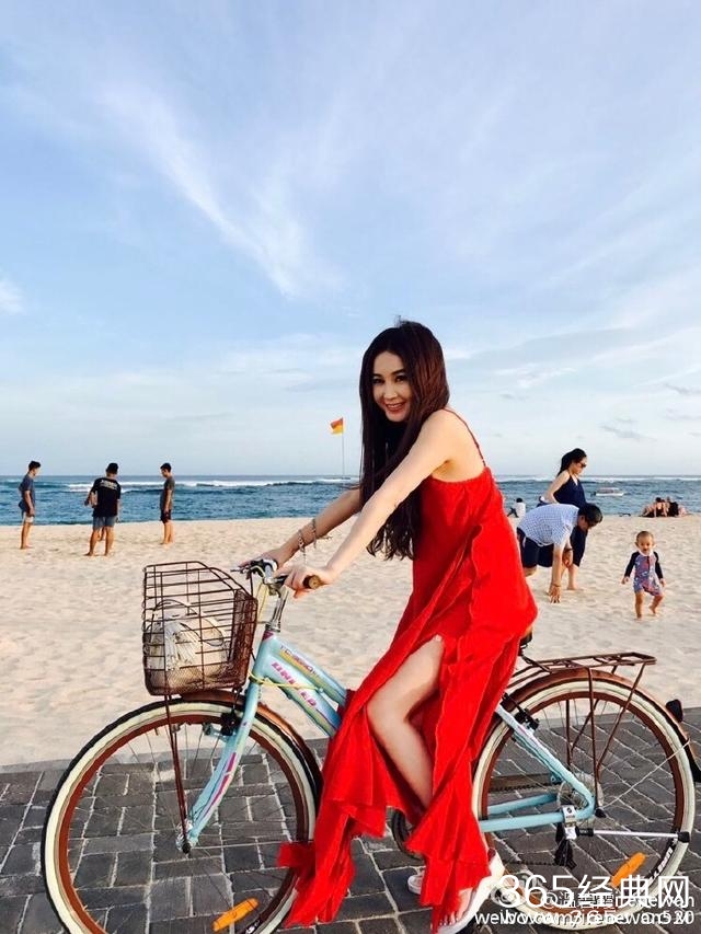 女神很喜欢收集吊带长裙,这件红色的吊带长裙,高开叉裙摆的设计,若影若现,骑着自行车,活力四射,一点都不像51岁的人。