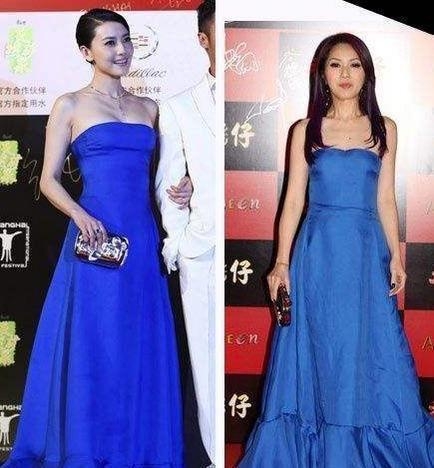蓝色礼服看起来十分的大气、再加上高圆圆的独有的气质,看起来很贵气的感觉。