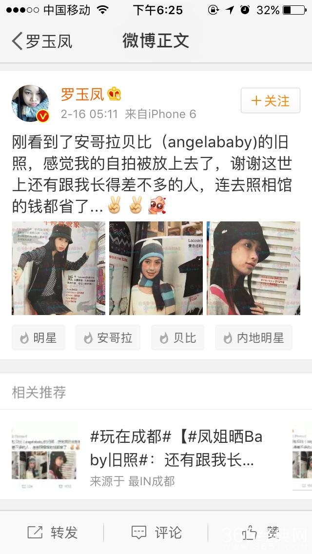 凤姐在微博晒杨颖旧照调侃还有跟我长得差不多的人,凤姐在经历了“打赏门”之后,凤姐又将“矛头”指向了Baby。2月16日早晨,罗玉凤在微博晒出三张@Angelababy 早前为某杂志拍摄的写真封面,并配文“谢谢这世上还有跟我长得像的人…”不过说实话,看了这照片的对比吧,感觉是有点像但是话又说回来,罗玉凤这次难道没考虑后果?说真,这是Baby被黑最严重的一次没有之一……