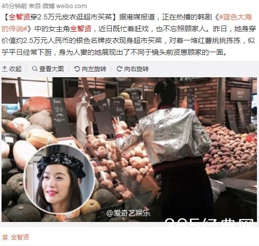 这不,近日有媒体报道全智贤身穿价值约2.5万元人民币的银色名牌皮衣现身超市买菜~