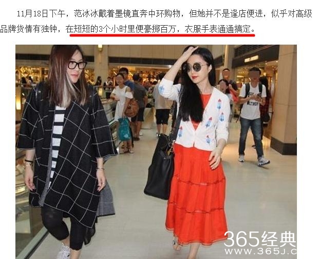 有媒体爆料范冰冰在拍戏空挡去逛了次商场,3小时花费了400万台币。