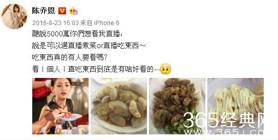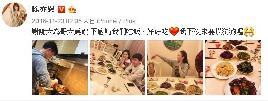 在《我们来了》节目中,我第一次发现陈乔恩真的很能吃,她曾说过“自没有什么是不敢吃的。“陈乔恩坦言自己吃得最多的一次,曾经吃到躺在地上起不来,她的经纪人“吐槽”说:“陈乔恩最常说的一句话就是有什么可以吃的。陈乔恩会在微博里不定期花式晒美食照片,从肥肉到内脏再到小零嘴。除此以外,她还会发各种可爱自拍,美女配美食,更加秀色可餐。