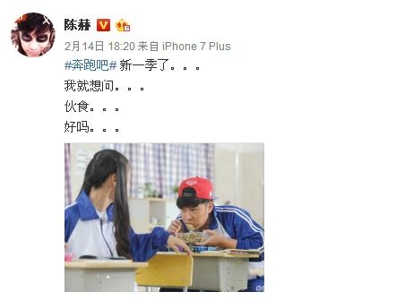 昨日,在《奔跑吧》新一季跑男成员宣传时,其他的人都比较正常,可是一到陈赫这里画风突变,他发博称:“奔跑吧新一季了,我就想问,伙食,好吗”。就算你是一个吃货,也不必时时刻刻惦记着吧。随手翻了翻陈赫的微博,不得不说,他真的是个不折不扣的吃货。