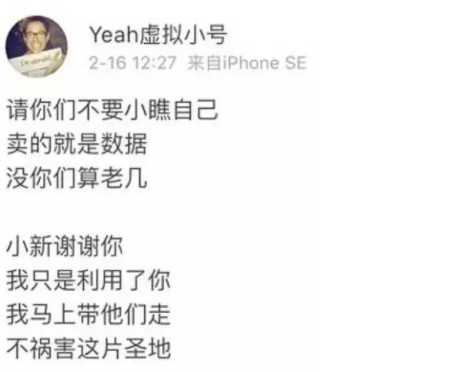 在已删除的郑爽小号发布的一条微博上看,它告诫粉丝不要小瞧自己,新浪不过卖的就是数据,没有了粉丝,微博算老几。她对新浪说:小新,我马上带他们走,不祸害这片圣地。