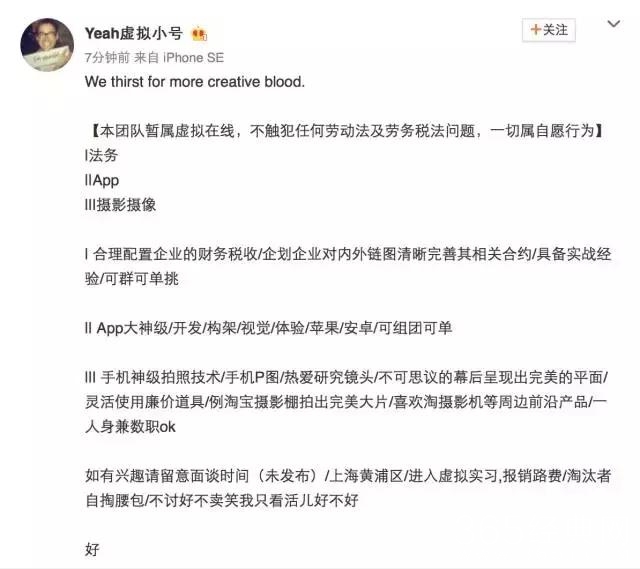 在这则最新的微博里,虚拟在线需要招聘法务、APP、摄影摄像、财务等诸多职位。除了芒妈提到的上线APP需要员工,可能郑爽还需要反拍狗仔的摄像和收购门户网站的财务人员。