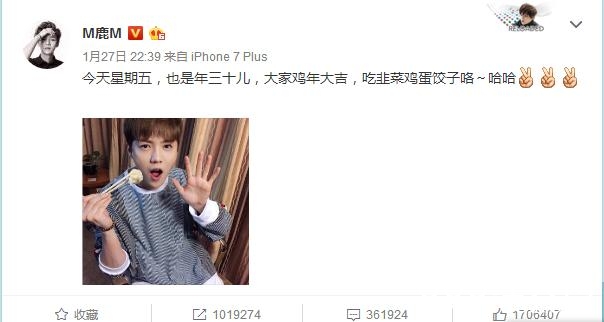 然后鹿晗十点零几分的时候表演完就回家了接着就看见发微博祝大家鸡年大吉,
