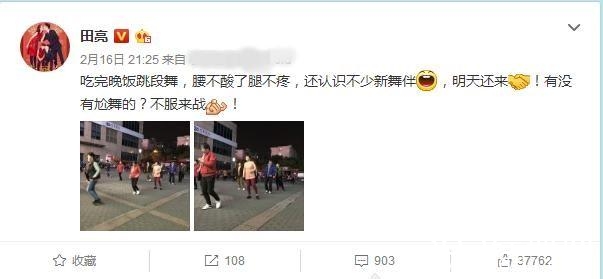 就在昨天晚上,田亮发博说:吃完晚饭跳段舞,腰不酸了腿不疼,还认识不少新舞伴,明天还来!有没有尬舞的?不服来战!