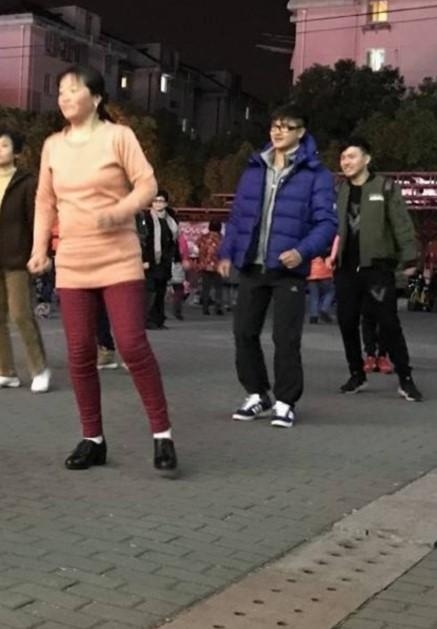 大家有看出来田亮是哪一个吗?紧随大妈身后,仔细的学着广场舞,那个戴着眼镜,穿着蓝色棉服的非常接地气啊!