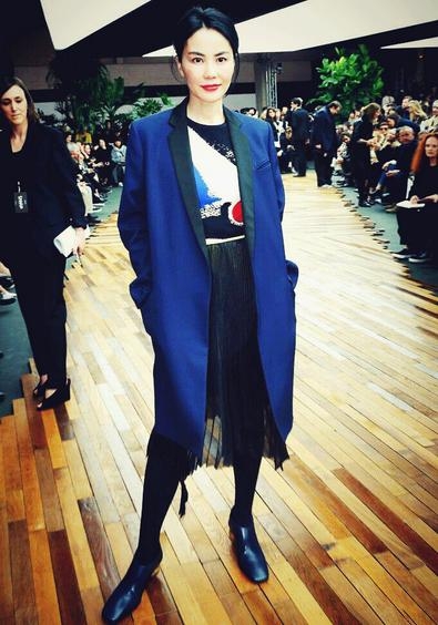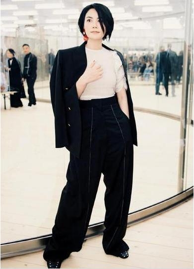 在巴黎看秀的王菲身穿白色的上衣,搭配黑色的西服套装,脚踩时尚个性的黑色皮鞋,一头清爽的短发,简单的黑白两色搭配就可以非常帅气!