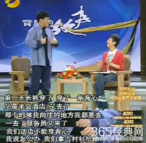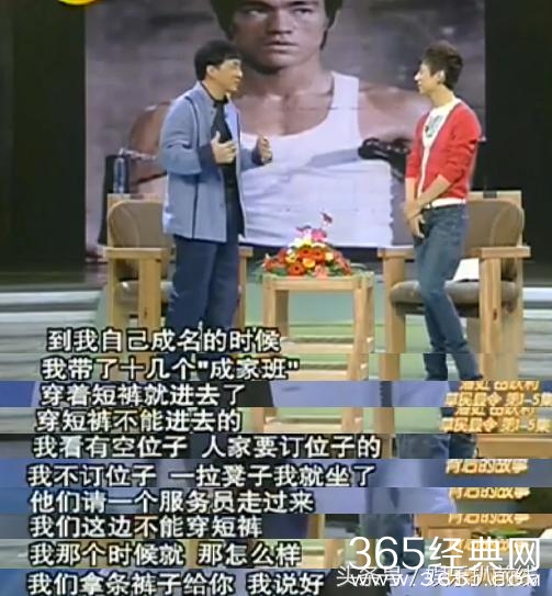 成名之后(此时,成龙已经站起来了,加上肢体动作来讲述这个事情),带了十几个“成家班”穿着短裤就进去了,半岛酒店是不能穿短裤进去的,成龙也不等服务员说,大摇大摆的走进去,也不定位置,看到凳子就拉来坐下了,服务员就跑过来告诉成龙说不能穿短裤进来,成龙嚣张的回应,“那怎么样,我已经坐下了”,最后服务员说拿一条裤子给你,成龙说好,然后裤子拿来之后成龙就当着大家的面提上了裤子,拉链也不拉就继续坐在那里等邵逸夫。▼
